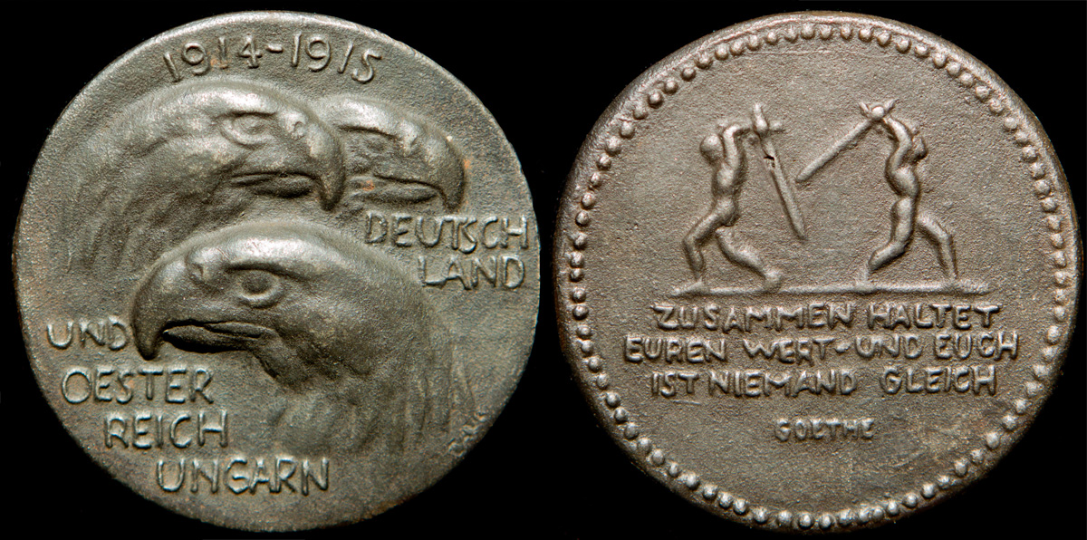 This medal was a reward for donating at least 25 marks to the Red Cross in 1915. The obverse shows the heads of the Austrian double-headed eagle atop the head of the German heraldic eagle below a heading of "1914-1915". To the right of the German eagle is "DEUTSCHLAND" ("Germany") and to the left is "UND OESTERREICH UNGARN" ("and Austria-Hungary"), the two central powers.