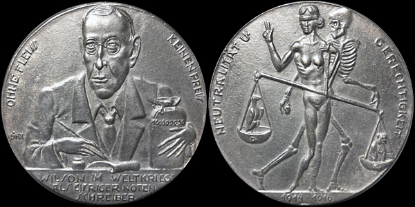 Obverse: Half length en face caricature of President Woodrow Wilson in coat and tie, open shirt collar, at writing desk, pen in right hand, left clutching money bag marked 100000000; title legend upper edges left and right, separated by image; three-line inscription WILSON IM .WELTKRIEG' / ALS EIFRIGER NOTEN / SCHREIBER (Wilson in the 'World War' as zealous note-writer) in exergue; artist's signature LINDL lower left; raised rim contiguous with exergue.