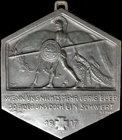 Obverse: On raised ground-line exergue, archaic Greek warrior in corselet and crested helmet striding to left alongside bridled horse; in left hand diagonal lance and round shield with ship motif; right hand trailing behind, dragging crocodile (dragon?) skin; two-line inscription WENN UNS NICHTS MEHR ÜBRIG BLIEB / SO BLIEB UNS DOCH EIN SCHWERT (if nothing more remained to us / there yet remained a sword) in exergue; poet's name E. v. —— GEIBEL beneath inscription, left and right, respectively; year date 19 [Iron Cross] 17 at lowest point of hexagon; artist's monogram interlaced MV lower left above exergue; thin raised rim.