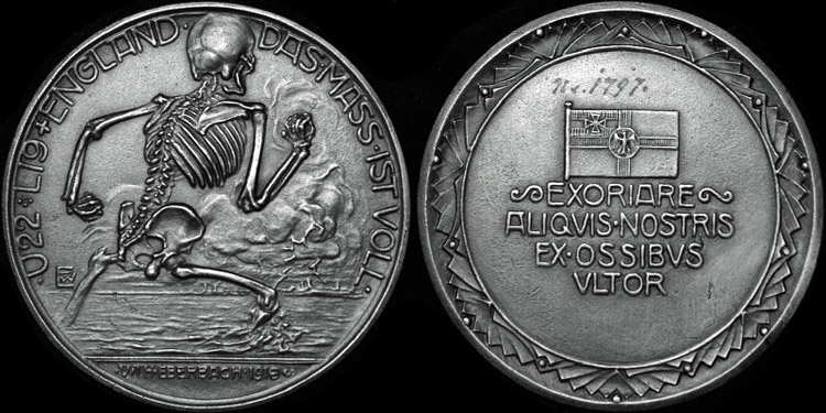 Obverse : Death with clenched fists, walking through the sea towards England over which hovers a Zeppelin partly obscured by clouds. In border, "U 22 — L 19 —England — Das Mass ist volt" (The cup is full).