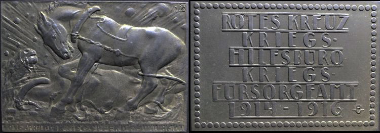 One of a series of donation plaquettes for the three relief organizations, all with the same pattern on reverse but with different obverses.   Among the few medallic representations (cf: Ludwig Gies) of the hazardous plight of horses - the main form of transport - in all armies of the time.
