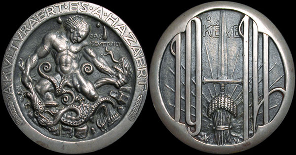 Warrior fighting hydra surrounded by "For Culture and Fatherland"  Reverse has stylized "1914" with wheat sheaf and sword in center.  For the Society of Artists, Budapest (KÉVE)