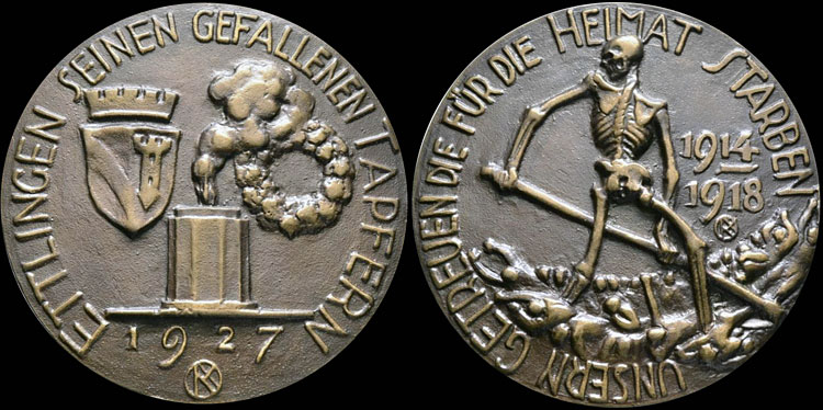 Totentanz" design on a 1927 memorial medal measuring 97 mm to the fallen soldiers of his home town of Ettlingen (see attached photo - medal not in my collection).