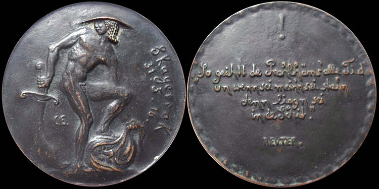 Reverse: Poorly defined roped or chained rim; at upper center large exclamation point (!), below which four-lines inscription text in script: „So geiht't de Prahlhäns' alle Tid / un wenn sei mein'n sei stahn / denn liggn sei / in de Schit." ("That's how it is all the time with braggarts, and when they think they're standing up, they're lying in shit."); below center the name REUTER.
