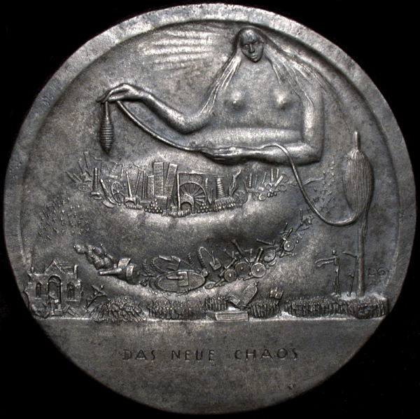 This medal exhibits a comprehensive description of a disrupted world view unique among other medals of the war period. In common with other artists of the Munich School, Gies adopted the medieval images of the Dance of Death , and in another medal of 1917 he depicts a weary group of German soldiers being led into battle by a skeleton. Here ‘The New Chaos’ surpasses these pieces in many respects.