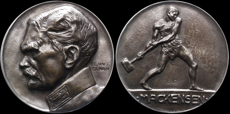 • Benno Elkan.  (1916?).  ●MACKENSEN●.  Cast iron, lightly blackened, patina resembling bronze, 79 mm, 179.09 g.  Vorzüglich (extremely-fine), light oxidized spotting reverse, cleaned and stabilized.  Scarce.