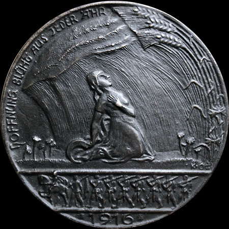On center of a grassy ground-line a young woman in a flowing dress kneels facing right, left hand on breast, her right dropped at her side holding a sickle; across upper field a wave of wheat ears arches over her; title legend around upper left rim; double exergue below ground-line: in upper section a column of seven soldiers advances to left, led by a mounted officer and a flag-bearer on foot; in lower section the year date *1916*; artist's signature K∙Ott lower right above exergue; raised rim.
