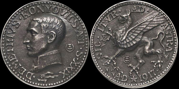 Demeter Konjović (also Konyovics, Konjovits, etc.) was a renowned flying boat pilot of the K u. K (i.e. Austro-Hungarian) Navy in the Adriatic.  Some German propaganda art mistakenly depicted him piloting float-planes, hence the inaccurate aircraft image on this medal.  Perhaps the hybrid nature of the griffin reflects the hybrid nature of seaplanes.