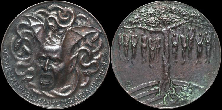 ・SOVIETREPUBLIKA・HUNGARIA・III・VII・1919・ (Soviet Republic - Hungary - March - July 1919). Cast bronze, verdigris patina, 71.4 mm, 101.52 g. Vorzüglich (extremely fine). Very rare.