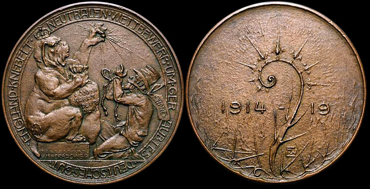 ・ENGLAND・KNEBELT・ — NEUTRALEN・WETTBEWERB・UM・GER — AUBTES・DEUTSCHES・GUT・ (England stifles neutral competition for stolen German property).  Cast bronze, light-brown patina, 69.5mm, 84.51 g.   Beveled edge (diameter of reverse slightly smaller than that of obverse).  Edge-punch of uncertain meaning (E - ?).  Vorzüglich (extremely fine).  Rare!