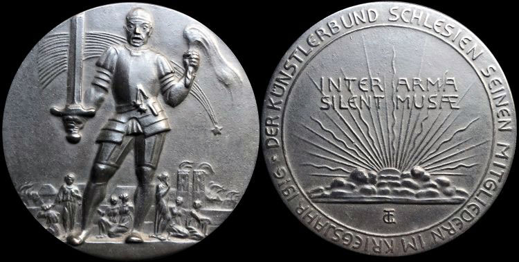 Reverse: Legend ・DER KÜNSTLERBUND SCHLESIEN SEINEN MITGLIEDERN IM KRIEGSJAHR 1916 (the Artist's Association of Silesia to its member in the war year 1916) around lined border; in background radiant sun rises above cloud bank; two-line title inscription upper field amid sun rays; artist's monogram entwined TG in exergue.