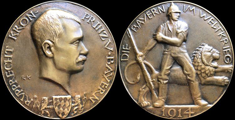 RVPPRECHT  KRON  -——  PRINZ V・BAYERN (obv) / DIE — BAYERN — IM WELTKRIEG (rev) (Rupprecht, Crown Prince of Bavaria / Bavarians in the World War).  Cast bronze, light-brown patina, 85.3 mm, 212.48 g.  Vorzüglich (extremely fine).