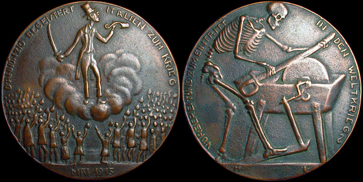 D'ANNUNZIO  BEGEISTERT —— ITALIEN  ZUM  KRIEG (D'Annunzio inspires Italy to war).  Cast bronze, 73.0 mm, 112 g.  Gussfrisch (as cast).  Rare in bronze (also issued in iron).