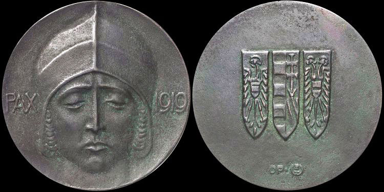 PAX  ——  1919 (Peace 1919).  Cast bronze, dark verdigris patina; 68 mm, 86.76 g; vorzüglich (extremely fine).  Very rare.