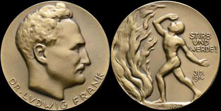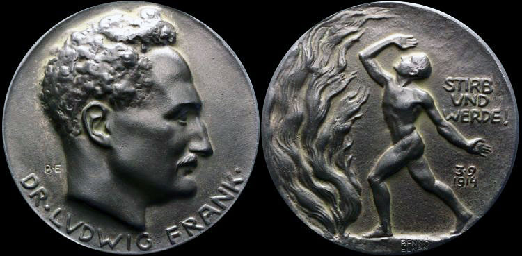 Although this medal bears the date 3.9.1914 and is sometimes described as made that year, Steguweit (p. 39) excerpts a letter dated 2 March 1915 from Elkan to Julius Menadier, Director of the Royal Coin Cabinet, Berlin (who had encouraged Elkan to design a medal honoring Frank), reporting that "The medal of Frank nearly finished.  Its reverse depicts a youth throwing himself into flames; in addition Goethe's words: 'Die and become'".  It then goes on to explain that the medal will be cast in a diameter of 9 cm and struck in a 3 cm issue.  Thus this medal was produced no earlier than spring 1915.