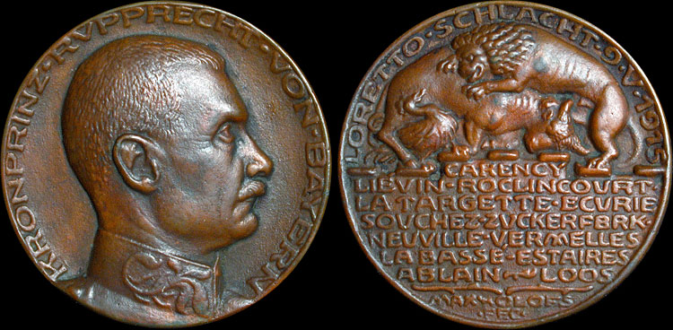 Reverse: A lion over a prostrate bull, menacing a cock with his paws. In border, "Loretto-Schlacht - 9.V.1915" Battle near Loretto, May 9, 1915). Legend, "Carency, Lióvin, Roclincourt, la Fargette, Ecurie, Souchez, Zuckerfbrk - Neuville, Vermelles, la Bassó, Estaires, Ablain, Loos