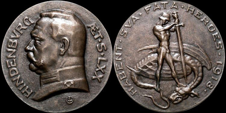 Stahhelm 3/4 to right, driving enormous sword vertically downward into the occiput of vanquished, coiled, winged dragon; legend HABENT ・ SVA ・ FATA ・ HEROES ・ 1918 ・(heroes have their destinies) around edge.