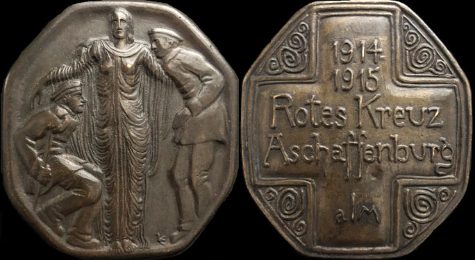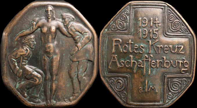 Variant with naked female figure illustrated in catalog of Heinrich Winter Münzenhandlung, Auktion 103, 21/22. September 2007, p. 10, no. 41: "Große Bronzegußmedaille (v. Ludwig Eberle) auf das Rote Kreuz in Aschaffenburg in der Kriegsjahren 1914/1915.  88 x 80 mm.  Selten, sehr schön   175 —."