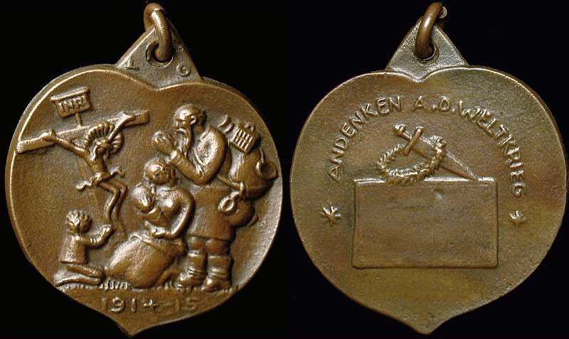 OBVERSE: On the grass covered ground a crucifix with an INRI plate at top leans back, and to the left. On the cross is Christ emanating aural light from his head; at the base rests a family of refugees. On the left is a little boy with hands raised in prayer; on the right is a young mother in three-quarter profile holding a baby. An old man with beard stands in profile facing left, he has his hands raised in prayer. He wears large boots and carries the family’s personal belongings on his back (pots, pans, baskets). In the exergue of the medal the raised script of 1914-15. The artist’s initials L G are located at the top on the triangular attachment.