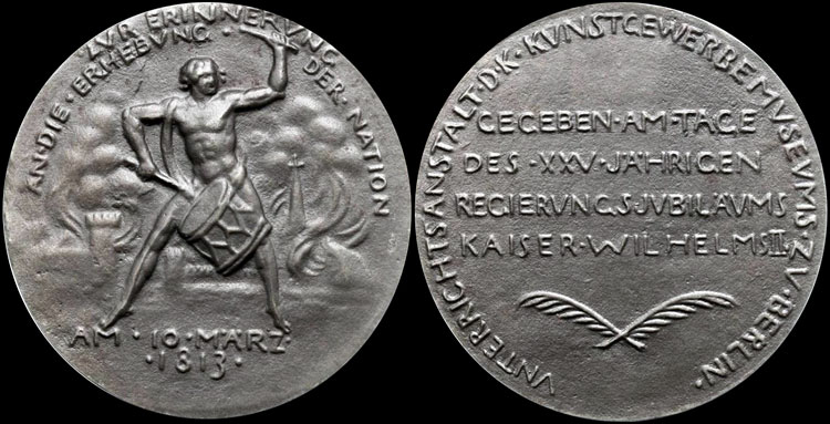 Obverse: naked drummer, legs spread wide, vigorously beats a drum; in background flames and smoke rise from fortified town; title double-legend upper edge, divided by image; two-line inscription AM ・ 10 ・MÄRZ∙ / ・1813 ∙  below drummer's feet.  Reverse: legend VNTERRICHTSANSTALT・D・K・KVNSTGEWERBEMVSEVMS・ZV・BERLIN・ (School of the Royal Applied Arts Museum, Berlin) surrounding edge; four-line inscription GEGEBEN・AM・TAGE / DES・XXV・JÄHRIGEN / REGIERVNGSJVBILÄVMS / KAISER・WILHELMSII. (presented on the the 25-year jubilee reign of Emperor Wilhelm II) ; two crossed palm fronds below inscription.