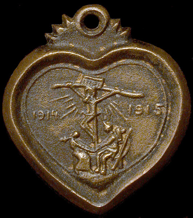 Heart-shaped flat surface with highly raised and graded edges. Framing lines are parallel to the edge. The image and the script are raised sculpturally above the surface.