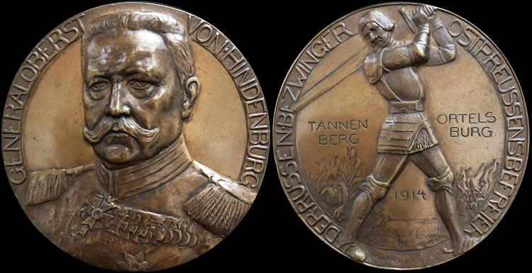 Reverse: Armored medieval knight striding to right, un-helmeted head turned to left, both hands wielding broadsword over left shoulder, poised to strike; background marsh grasses at left, burning village at right; legend DER・RUSSEN・BEZWINGER ——— OSTPREUSSENS・BEFREIER (conqueror of the Russians; East Prussia's liberator) on hammered band encircling edge, divided by image; two-line inscription TANNEN / BERG center left; two-line inscription ORTELS / BURG center right; year date 1914 lower center; artist's signature ALÖWENTAL lower right inside border band; maker's signature GRÜNTHALS lower left on border band.