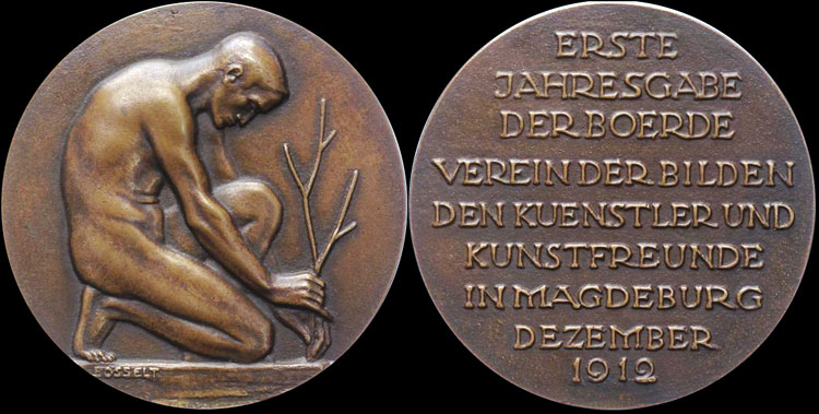 ERSTE / JAHRESGABE / DER BOERDE // VEREIN DER BILDEN / DEN KUENSTLER UND / KUSNTFREUNDE / IN MAGDEBURG / DEZEMBER / 1912 (First year's offering of the Börde Association of Visual Artists and Friends of Art in Magdeburg, December 1912).  Cast bronze, medium-brown patina, 71.8 mm, 130.42 g.  Vorzüglich+ (extremely fine+).