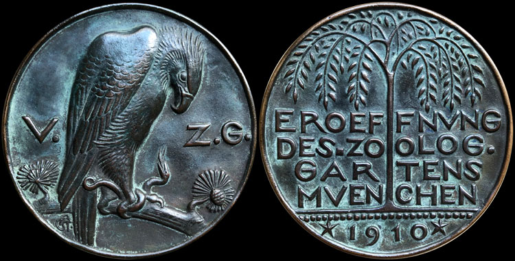 eingetragener Verein] (Association of the Zoological Garden, Munich, registered association) was founded in February 1905, and opened the Zoo to the public 1 August 1911. In 1909 and 1910, Arthur Storch designed a series of eleven medals of various sizes, depicting different animals, to commemorate the inauguration. The present medal is one of the largest of the group.