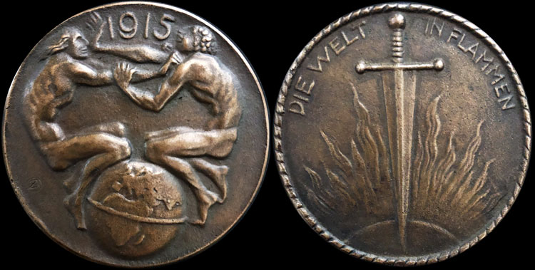 1915 (obverse) / DIE WELT —— IN FLAMMEN (the world in flames - reverse).  Cast bronze, medium-brown patina, some burnishing, 65.57 mm, 102.61 g.  Vorzüglich (extremely fine).  Rare.