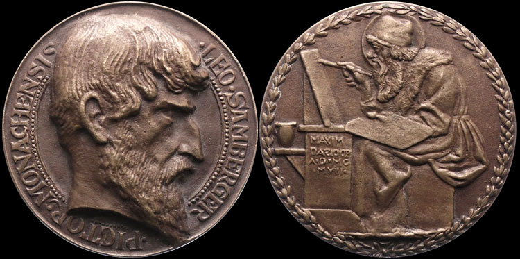 Leo Samberger (1861 - 1949), honorary member of the Münchner Akademie der Bildenden Künste (Munich Academy of Visual Arts), was known for portraits and historical scenes in a naturalistic, post-Impressionist style.  Dasio made several medals to honor him, including one to memorialize his engagement (Weber, pp. 41-42, and 91-92).