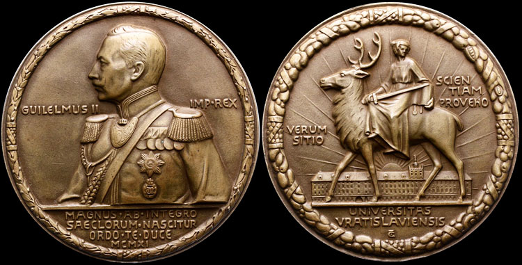 UNIVERSITAS  /  VRATISLAVIENSIS (University of Beslau).  Cast yellow bronze, light-brown patina, 93.6 mm, 248.8 g.  Edge-punch C.POELLATH  SCHROBENHAUSEN.   Fast gussfrisch (near as-cast), few slight scratches to patina.