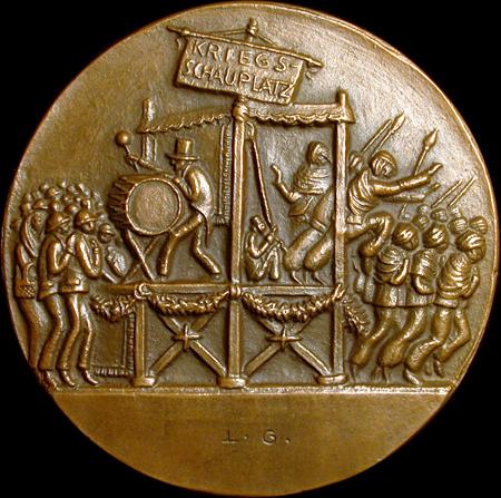 Scenic sequence from left to right: a densely packed group of people, including women, looks up at the drummer in tails and top hat, acting on a stage constructed of wooden beams festooned with garlands, draperies, and a canopy; to the right of the curtain, raised by a monkey in costume and lifted by a rope, a uniformed man with lance and a turban-like headgear descends from the stand to join other marching men to the right.  Above the show booth, a banner with the inscription KRIEGS - SCHAUPLATZ raised on a crossbar; in the exergue a recessed L.G. is inscribed.  Edge stamp: C.POELLATH SCHROBENH.