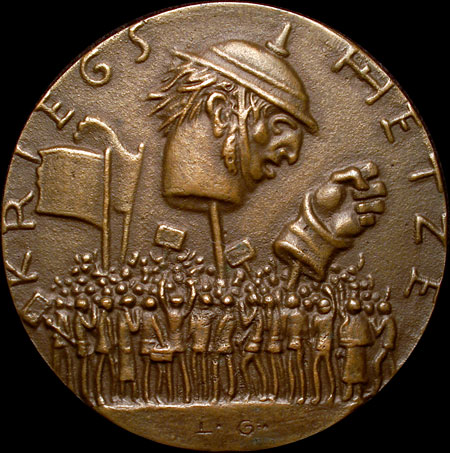 Image of a large head with distorted features, profile right, wearing a flat helmet with spike and chin-strap. The severed head is held above the anxious and gesticulating crowd on a pike, as is a clenched gauntlet. The men and women carry flags and banners. Rim inscription reads KRIEGS - HETZE (War Mongering). The artist’s initials, L·G·, are incised into the exergue.