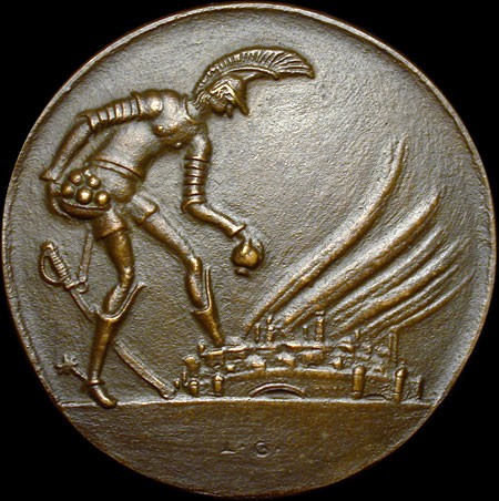 From the left, a powerful fighter figure in right profile wearing spurred high boots, chest armor, saber at his waist, shields on his hands, and a highly plumed helmet. Carrying a container of bombs in his right hand, he crouches slightly to carefully deliver a bomb from his left hand into the already burning and smoking citadel. In the middle of the exergue are the incised initials, L · G · of the artist.