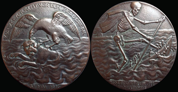 One of four "Totentanz" medal designs produced by Lindl.  All were likely issued in both bronze and iron.  This medal celebrates the German High Seas Fleet's "victory" at the Battle of Skagerrak (=Jutland).