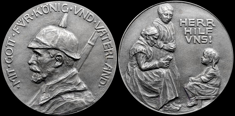 Cf: Klose, Dietrich O. A. 2016. Europas Verderben 1914 1918: Deutsche und österreichische Medaillen auf den Ersten Weltkrieg, pp. 139 - 140: 18.2.According to Weisser (p. 156), citing Julius Menadier (Director of the Berlin Münzkabinett, and a friend of the medallist), the soldier's portrait on the obverse is that of an anonymous reserve soldier met on the street while on leave and chosen to represent the simple enlisted men in the war effort and supported by family members on the homefront.