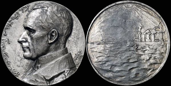 Reverse: Low-relief seascape with profile of SMS Emden at right steaming left; at left on horizon second ship steaming to left; overhead radiant sun; sharply raised rim.