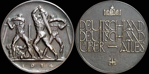 Josef Gangl.  1914.  DEUTSCHLAND / DEUTSCHLAND / ÜBER — ALLES (Germany, Germany above all else).  Cast bronze, dark brown patina, gilded lettering and images on reverse, 101 mm, 285.96 g.  Vorzüglich (extremely fine).