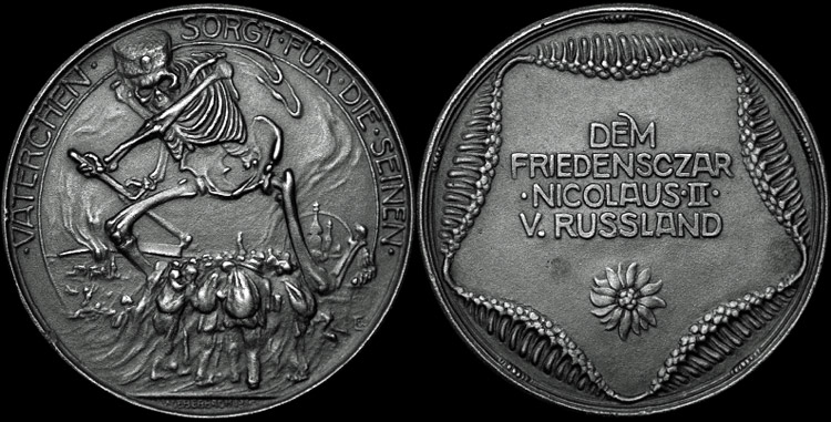 Reverse:: Pentagonal cartridge inscribed, "Dem Friedensczar Nicolaus II v. Russland" (Peace Czar Nicholas II of Russia) over flower blossom.