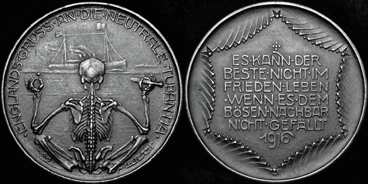 Obverse : Death, seated, in right hand a torpedo, in 1eft, a bomb ; S.S. Tubantia sailing in the distance. In border, "Englands Gruss an die neutrale Tubantia" (England's greeting to the neutral S.S. Tubantia).