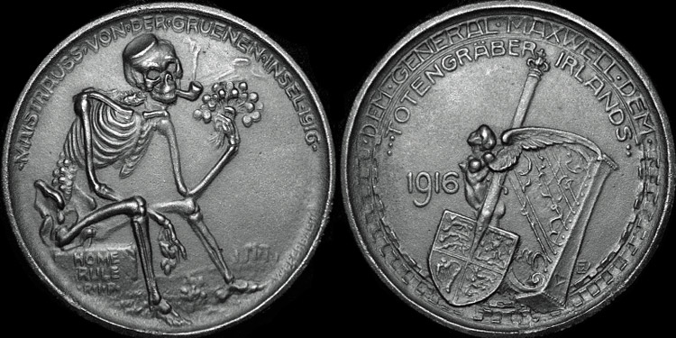 Reverse:: Spade decorated with the arms of Great Britain shoved through a harp (arms of Ireland). Date, 1916. In border, "Dem General Maxwell dem Totengraber Irlands" (To General Maxwell, Ireland's grave-digger).